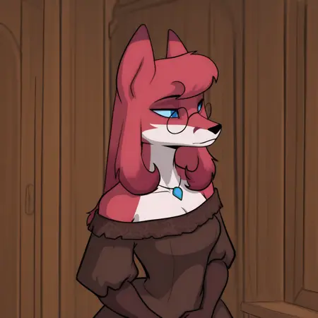 Kitty(초기 버전)solo, fox, k1tty1, red hair, red body, long hair, straight hair, hair on shoulders, blue eyes, two tone body, glasses, swept bangs, necklace, brown dress, bare shoulders, sleeveless, brown hands, fantasy, upper body, standing, looking at viewer, choker,