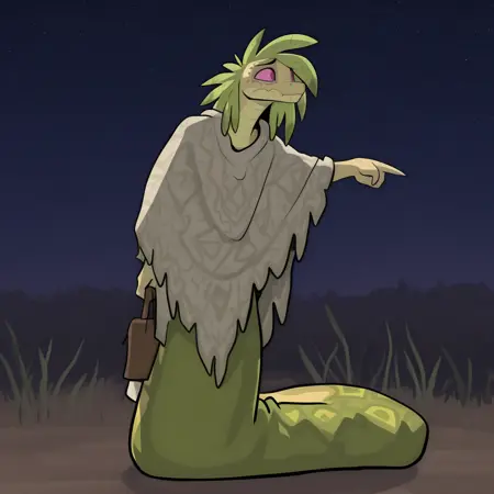 solo, male, anthro, rattlesnake, C0rn, lamia, apode, tan body, dreadlocks, pink eyes, green clothing, green hair, orange eyeliner, feather in hair, sleeveless, bracelet, full-length portrait, looking at viewer, slim, rattle \(anatomy\),