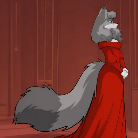 Kitty(현재 버전)solo, fox, k1tty2, grey hair, grey body, long hair, straight hair, hair on shoulder, blue eyes, two tone body, red dress, long dress, classy, standing, looking at viewer, front view, white hands, fluffy tail, holding weapon, red scythe, upper body, grey highlights,