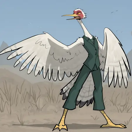 solo, anthro, crane \(bird\), red eyes, white feathers, 1cky, red face, yellow beak, feathered tail, feathered arms, winged arms, sleeveless, green clothing, high collar, green pants, front view, looking at viewer, long neck, slim, standing, yellow talons, necklace, full-length portrait,
