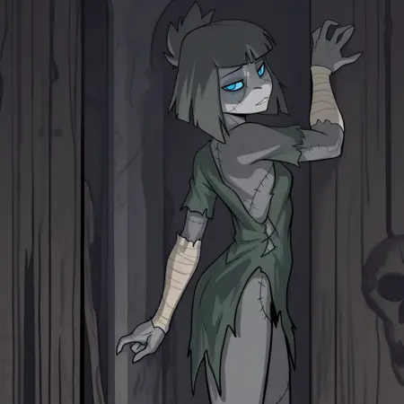 Patchwork girlsolo, humanoid, female, straight hair, medium hair, undead, surgical suture, short ponytail, grey skin, parted lips, skull, green clothing, rags, blue eyes, looking at viewer, slim, white armwear, standing, torn clothing,