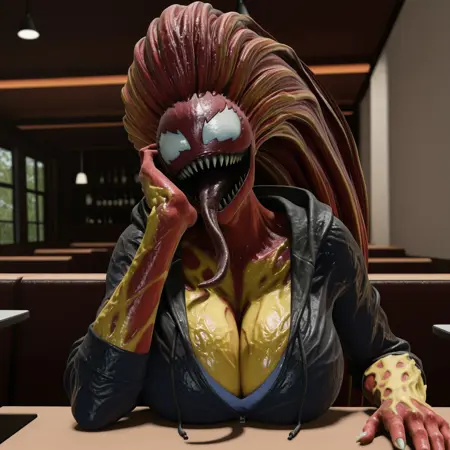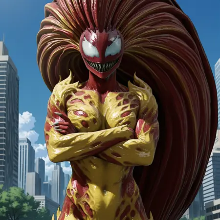 Positive Prompts: MJSS, humanoid, monster girl, symbiote, red hair, yellow hair, multicolored hair, very long hair, white sclera, no pupils, red body, yellow body, two tone body, sharp teeth, black inner mouth