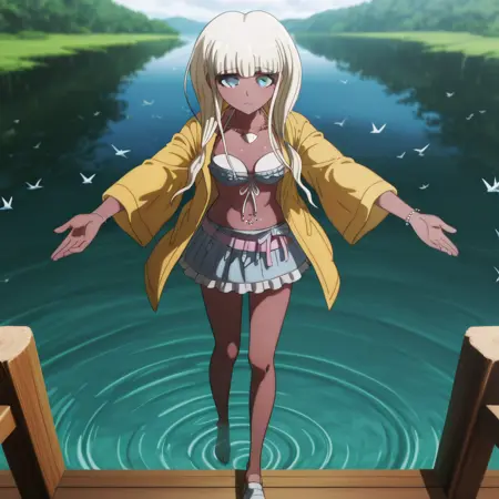 태그: danganronpa_(series), danganronpa_v3:_killing_harmony, yonaga_angie, 1girl, bikini, bikini_skirt, blonde_hair, blue_skirt, breasts, cleavage, frilled_skirt, frills, blue_eyes, jacket, jewelry, large_breasts, long_hair, long_sleeves, navel, necklace, yellow_jacket, pleated_skirt, shell, shell_necklace, skirt, solo, swimsuit, white_bikini