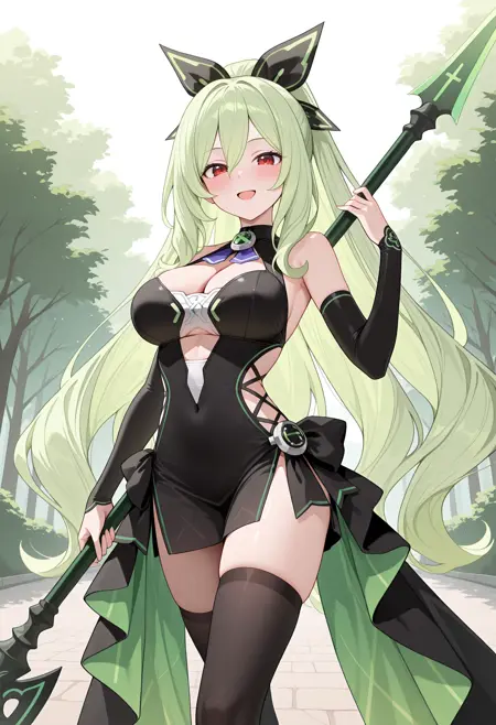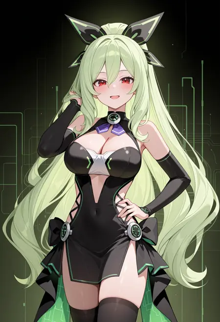 npchika, very long hair, green hair, red eyes, ponytail, hair ribbon,