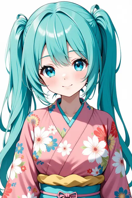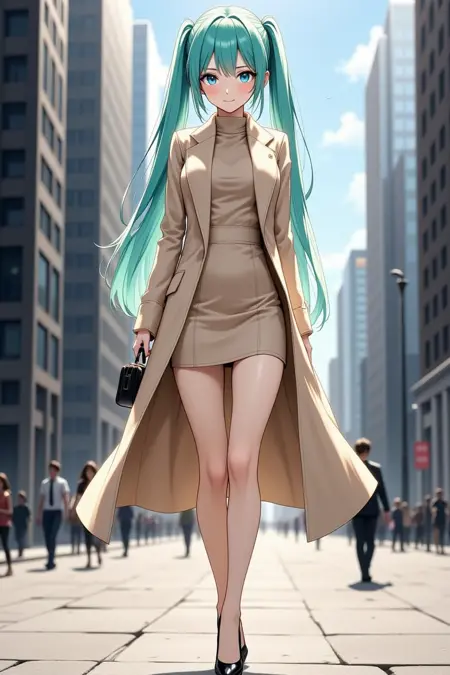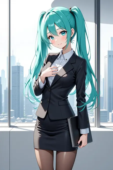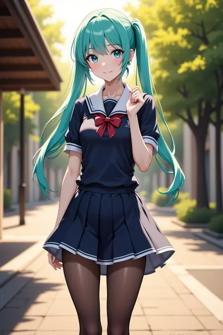 要获得经典风格,可尝试如下提示词:长长的青柠色双马尾、青柠色领带、无袖上衣等。