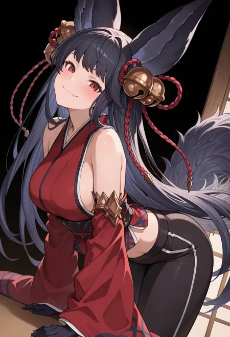 gbfyuel, 검은 머리, 긴 머리, 붉은 눈, 여우 귀, 에루네, 여우 꼬리, 송곳니,