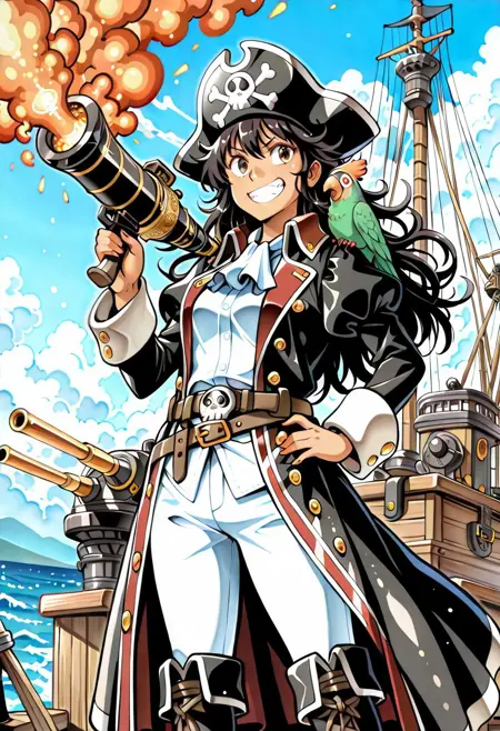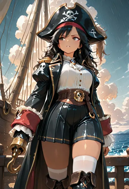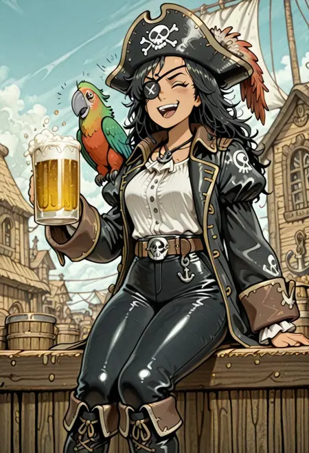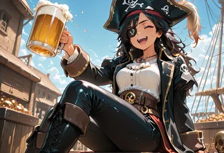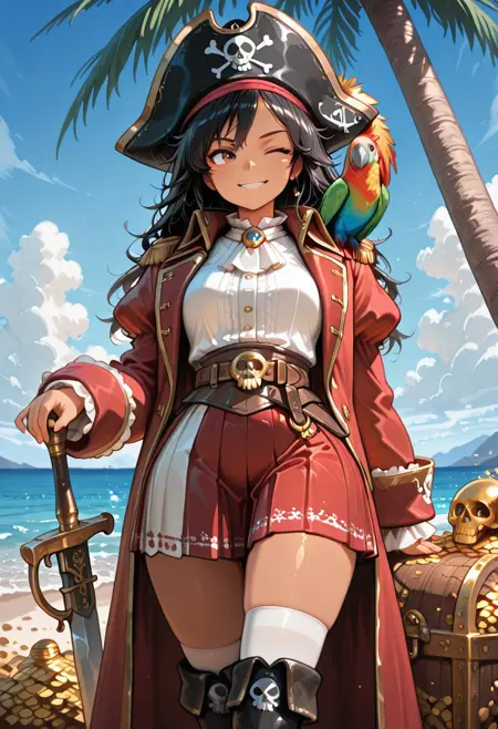 Tags Ex: pirate clothing, white long sleeve blouse, puffy sleeves, blue pants, leather belt, black pirate hat with skull and crossbones, black pirate eye patch, long black open pirate coat, black knee high boots, parrot on shoulder
