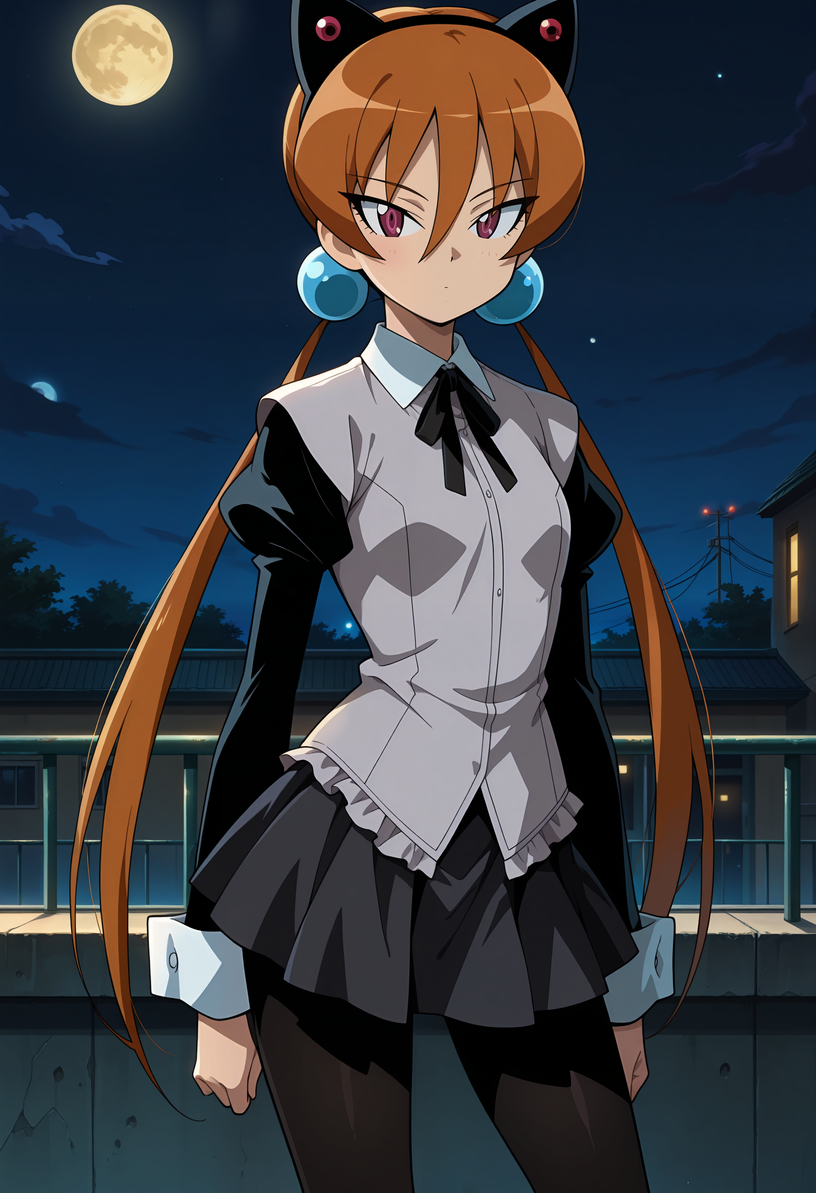 | 训练词汇 | wintails, orange hair,purple eyes, hair bobbles, hair hair ornament, tsurime collared shirt, school uniform, grey shirt,black ribbon,long hair,hair between eyes, long long sleeves, black pantyhose, hairband, low twintails, puffy sleeves, pleated skirt, frills,已复制! |
