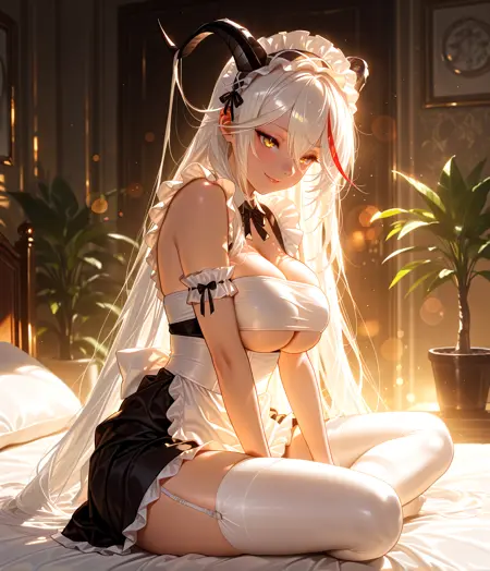 agirmaid、非常に長い髪、赤みがかった髪、白髪、黄色い目、悪魔の角、目の間の髪、前髪、角にかかる髪、大きな胸、メイドの頭飾り、白いエプロン、バンドゥ、アンダーブース、黒いスカート、フリル、白いガーター紐、白い太もも長ズボン、フリル付きアームバンド、