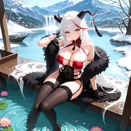 agirchina、非常に長い髪、赤みがかった髪、白髪、黄色い目、悪魔の角、目の間の髪、前髪、角にかかる髪、大きな胸、角の房、ハーネクネック、赤いアイパッチ付きビキニ、黒いフェザー・ボア、黒い手袋、骨盤カーテン、ガーターベルト、ガーター紐、レース-up太もも長ズボン、赤いハイヒール、
