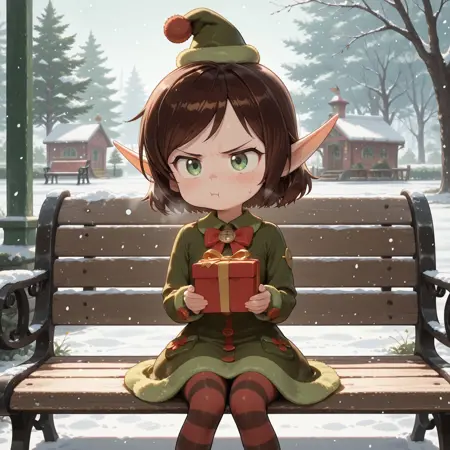 magee_pal, hat, brown hair, green eyes, pointy ears, dress, striped pantyhose