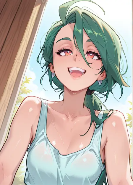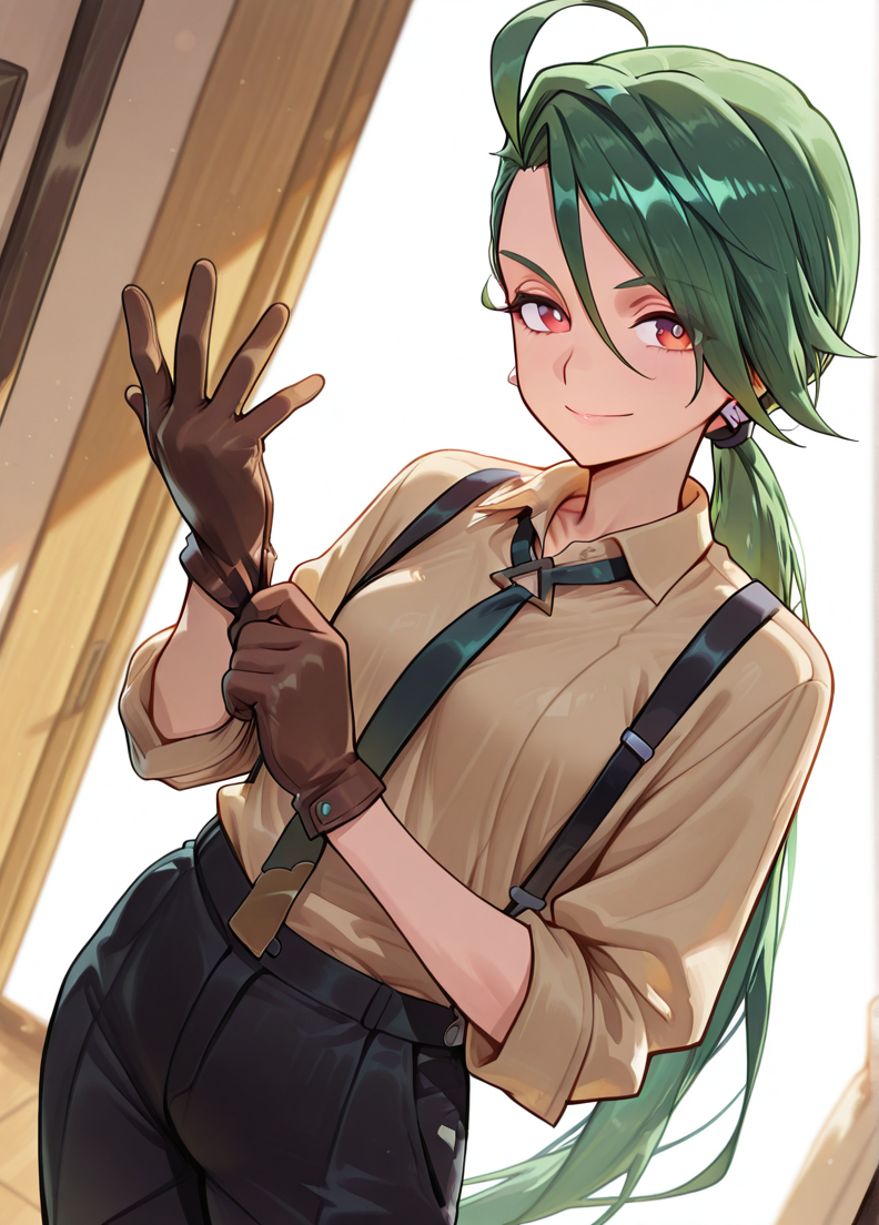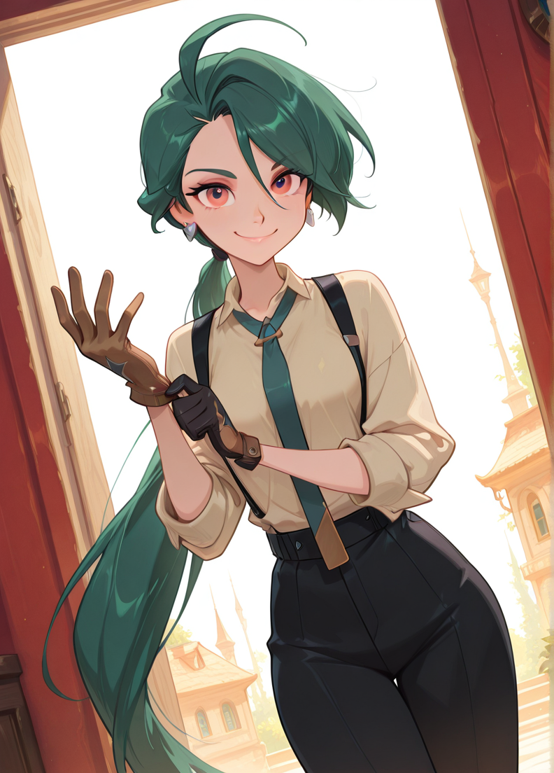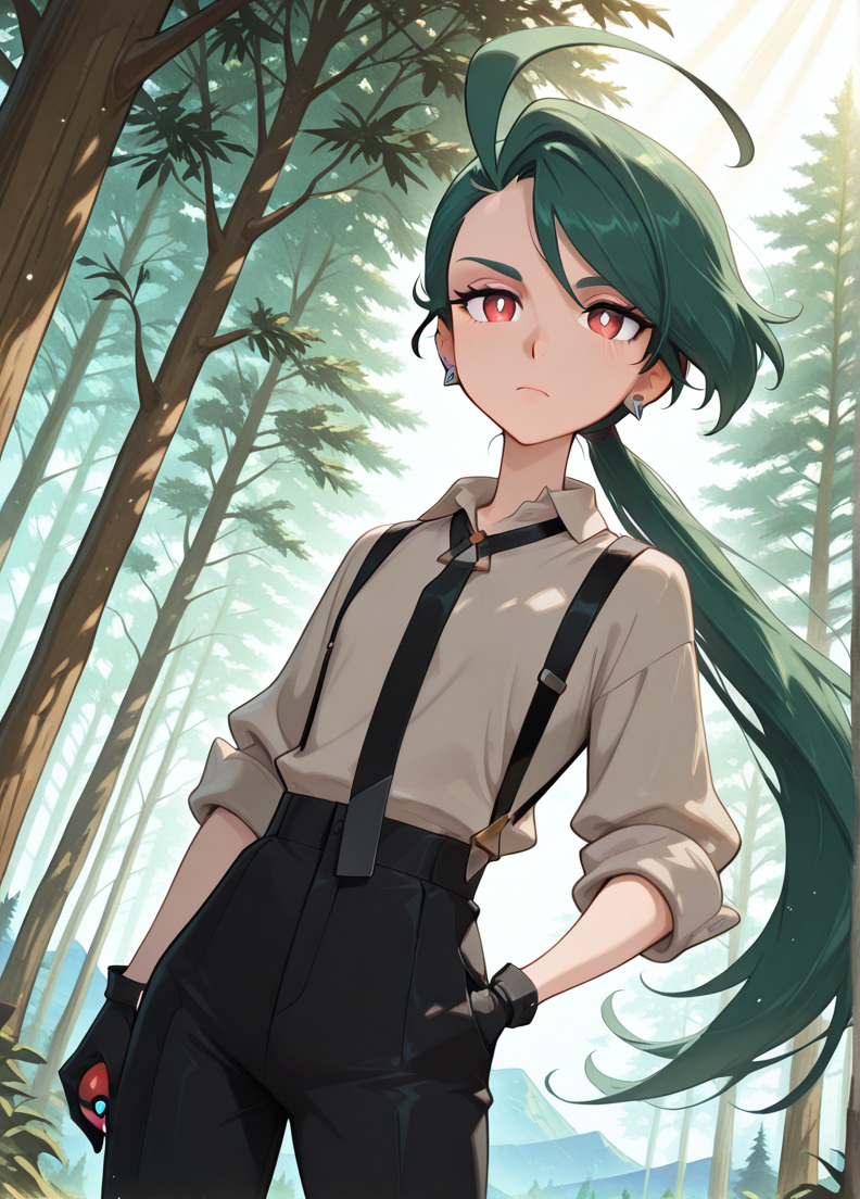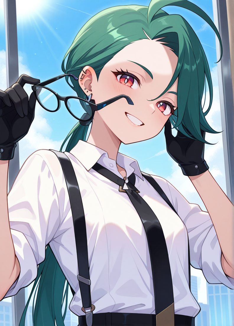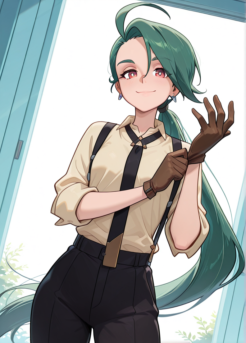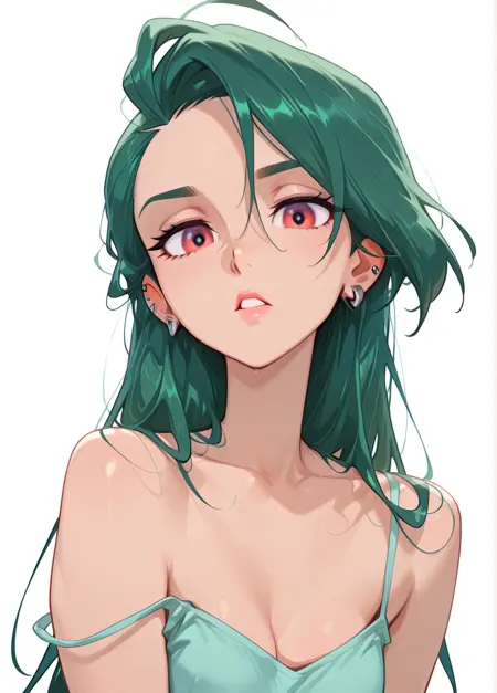 rikaxd, 1girl, long hair, green hair, ponytail, ahoge, earrings, low ponytail, red eyes,