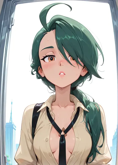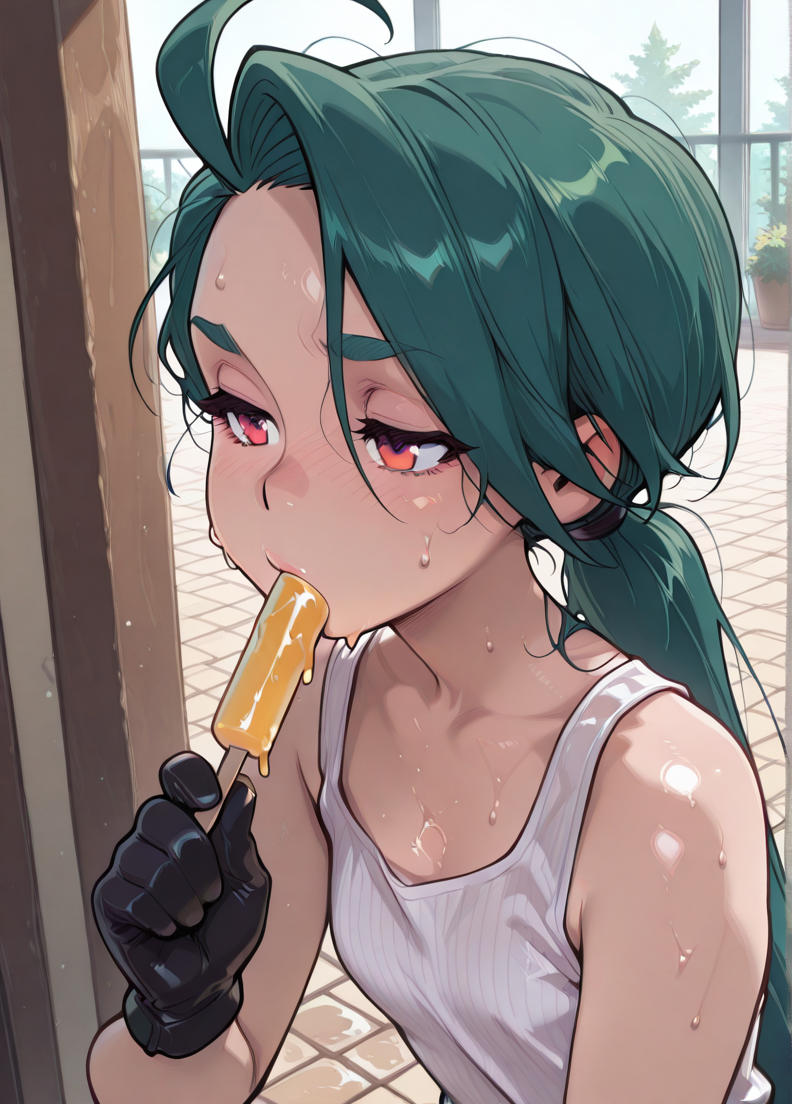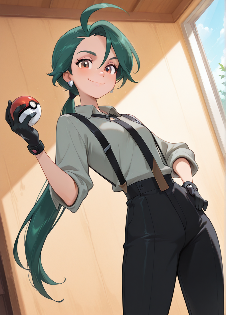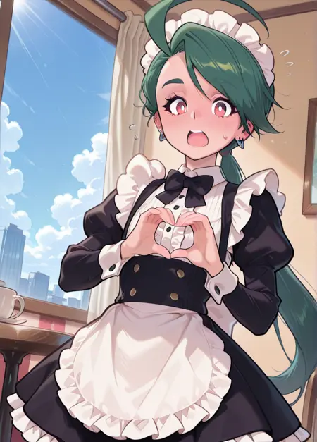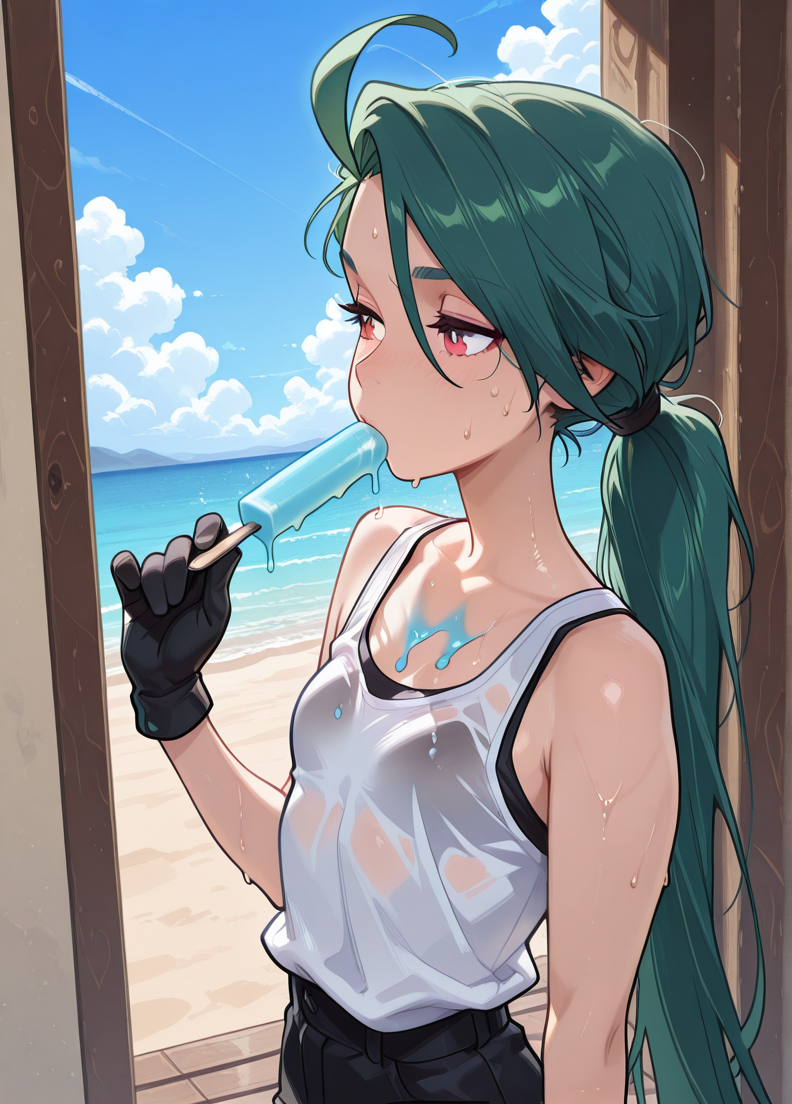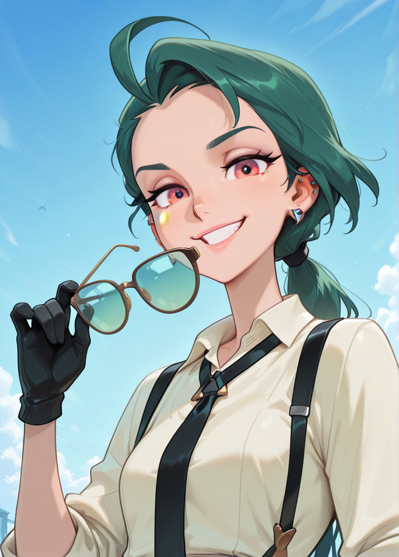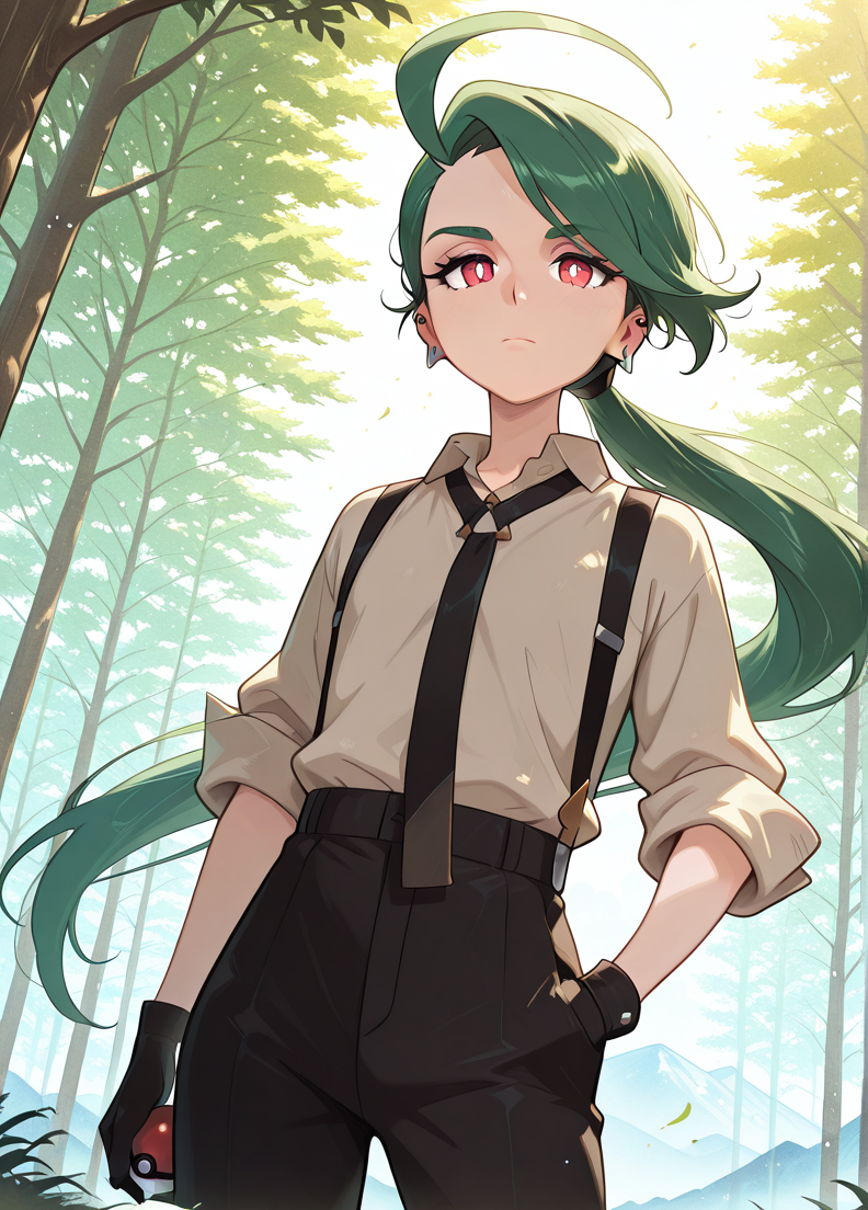 rikaxd, 1girl, long hair, green hair, ponytail, ahoge, earrings, low ponytail, red eyes,