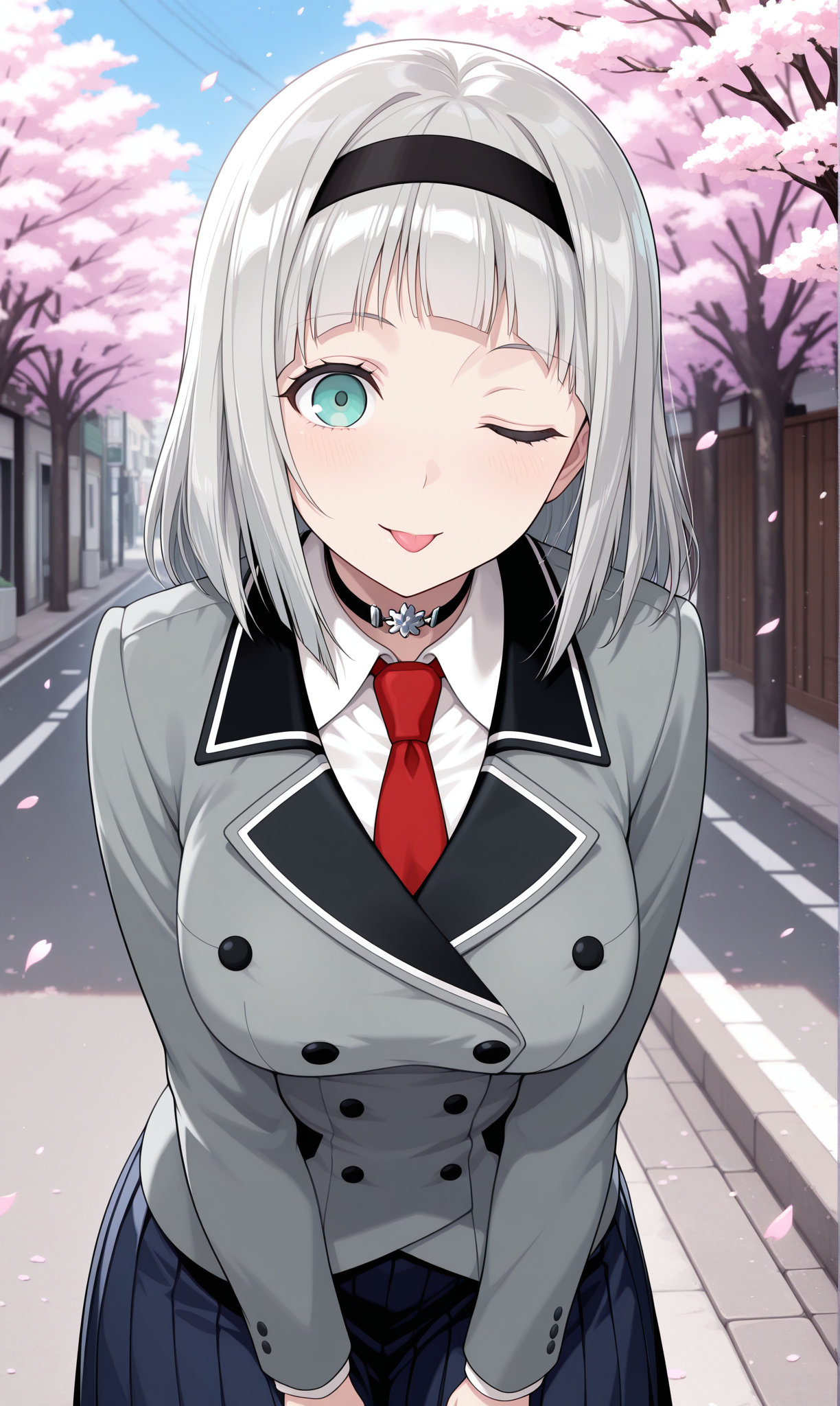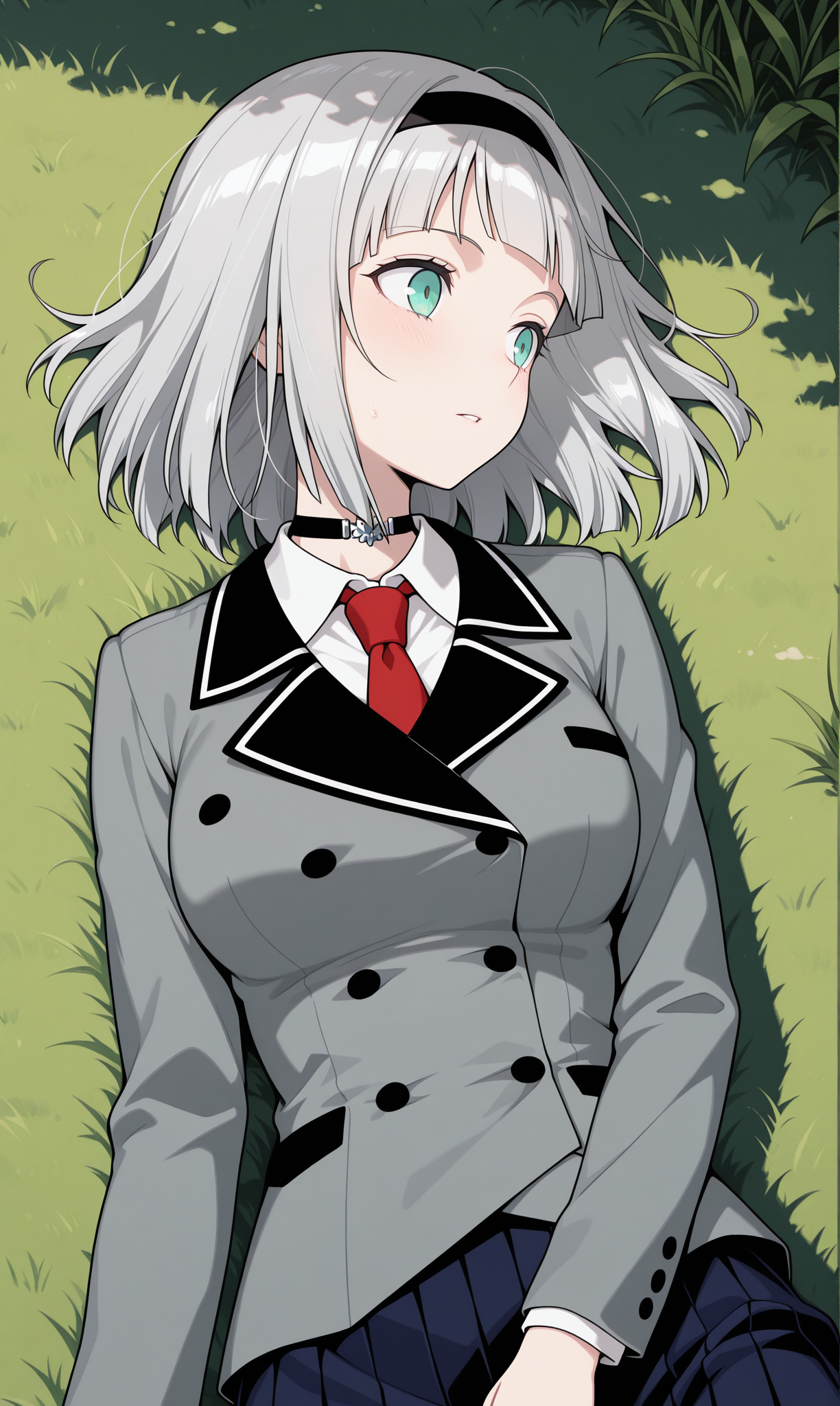 초커, 회색 재킷, 긴 소매, 칼라 셔츠, 빨간 넥타이, 파란 치마, 긴 치마, 주름 치마