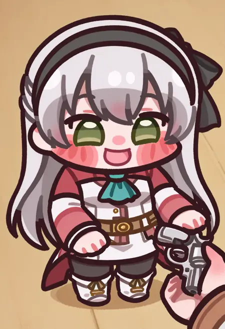 다음 태그들을 사용하는 것을 추천합니다: chibi, holding gun, handgun, pov, out of frame, 1other