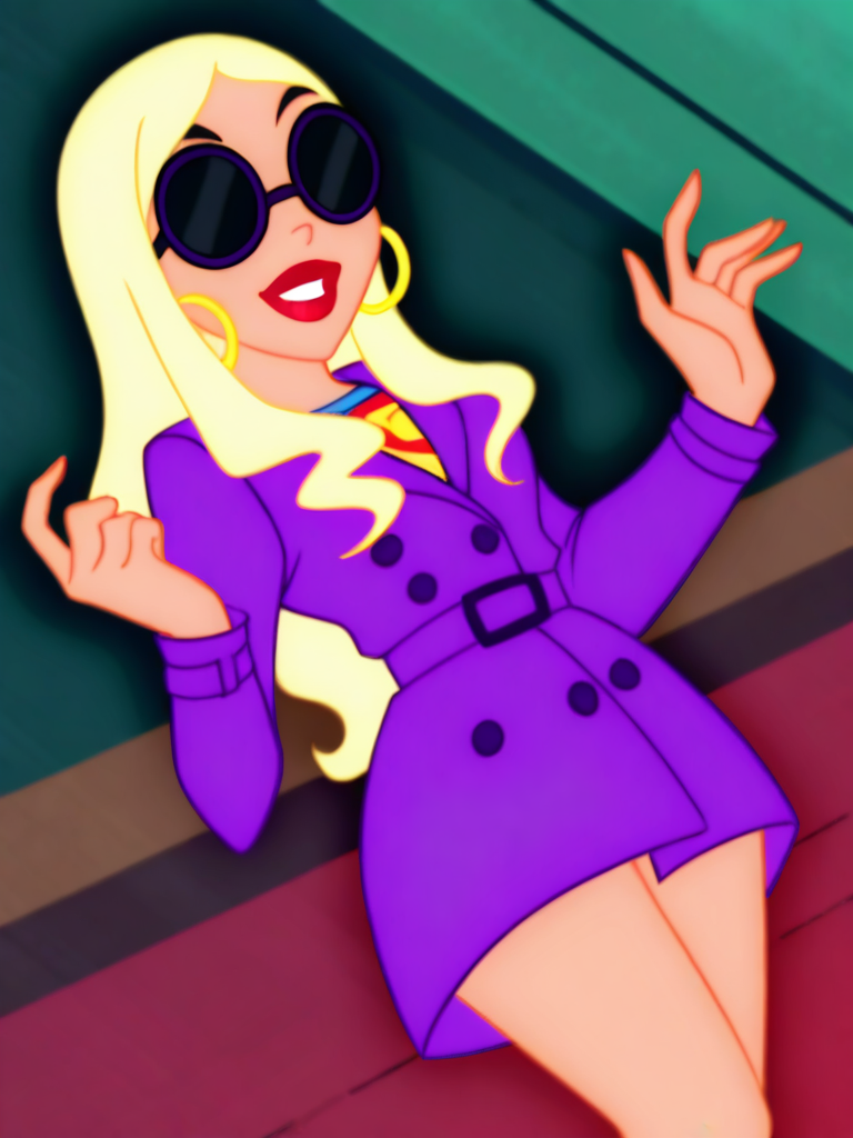 Use SGJLA, sgdis, sunglasses, high heels, blonde hair, earrings, jewelry, lipstick, red lips, long hair, hoop earrings, makeup, purple footwear, skirt, purple skirt, purple coat for her disguised appearance in that alternate dimension
