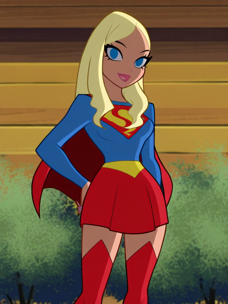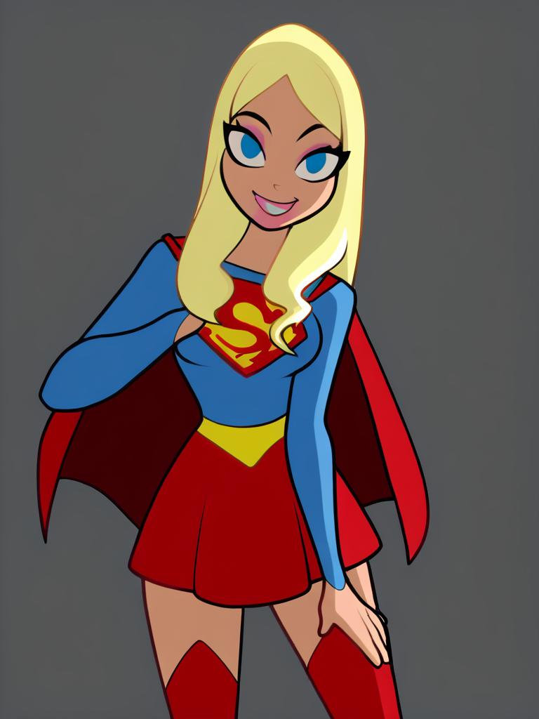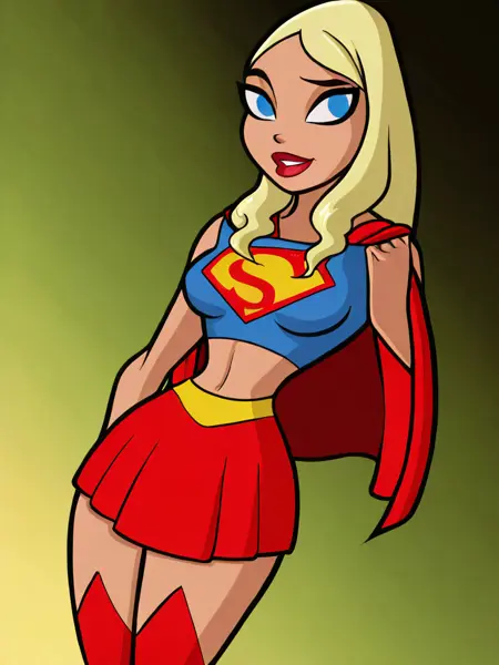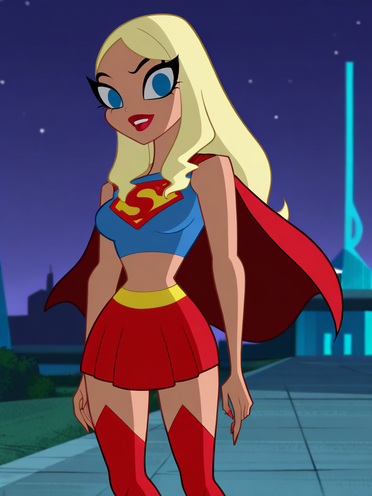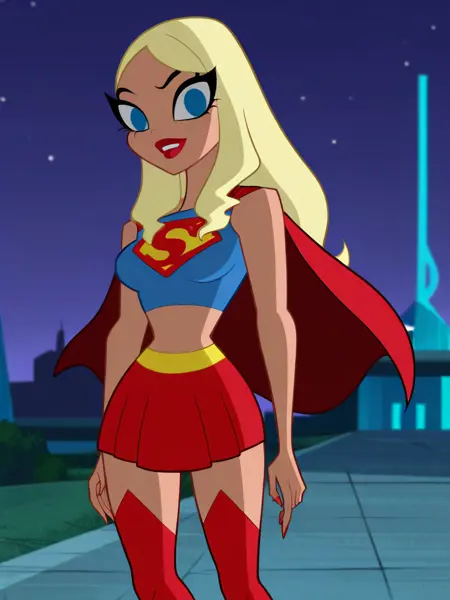 Use SGJLA, sgalt, skirt, blonde hair, blue eyes, cape, midriff, long hair, makeup, crop top, miniskirt, thigh boots, lipstick, superhero, red cape, red skirt, red lips, zettai ryouiki, medium breasts for her appearance in an alternate dimension