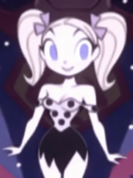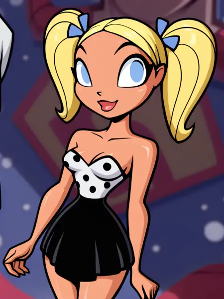 Use SGJLA, sghick, twintails, white shirt, polka dots, black skirt, medium breasts, bare shoulders, cleavage, strapless, blonde hair, black dress, blue eyes, hair bow for her appearance in a TV commercial by Mr. Myx. This one is highly unstable tho.