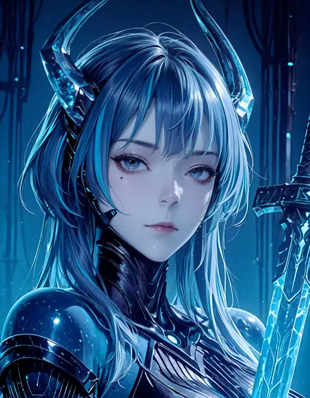 役立つタグ: swallowed_star, artificial_intelligence, energy_body, pale_skin, 1girl, bodysuit, horns, grey/blue eyes, blue/grey hair, wings, tail