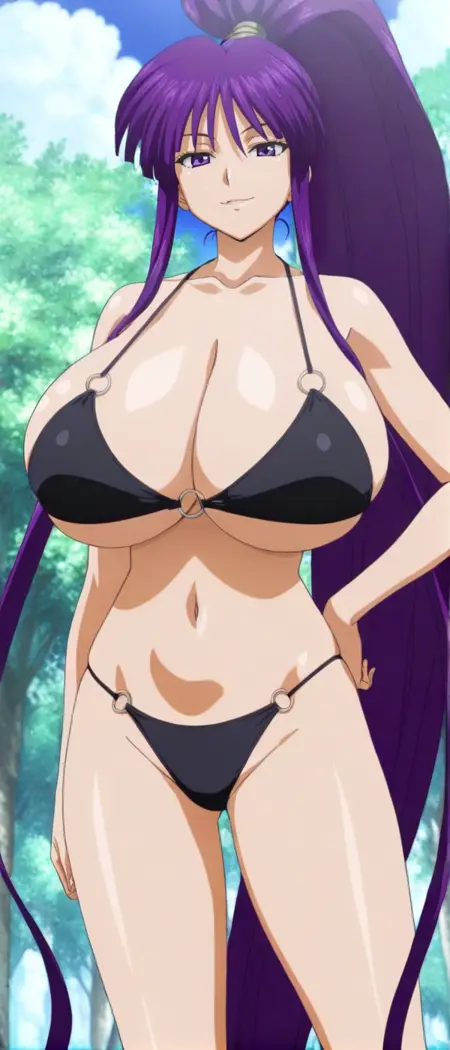 purple hair, very long hair, high ponytail, purple eyes