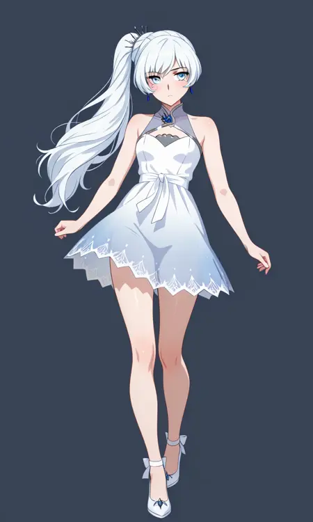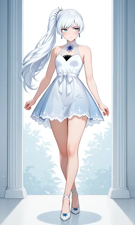 Weiss Schnee (RWBY All Volumes), 1girl, white hair, blue eyes, long ponytail, side pontyail, scar across eye, breasts, small breasts, thighs, white dress, sleeveless, bare shoulders, see-through, shoes