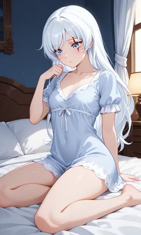 Weiss Schnee (RWBY All Volumes), 1girl, white hair, blue eyes, long hair, hair down, scar across eye, breasts, small breasts, thighs, pajamas, short sleeves, nightgown, sleepwear, barefoot