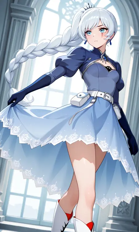 Weiss Schnee (RWBY All Volumes), 1girl, white hair, blue eyes, long ponytail, braided ponytail, scar across eye, breasts, small breasts, thighs, long dress, belt, pouch, dark blue gloves, long gloves, puffy sleeves, boots