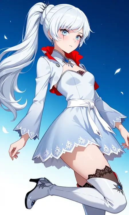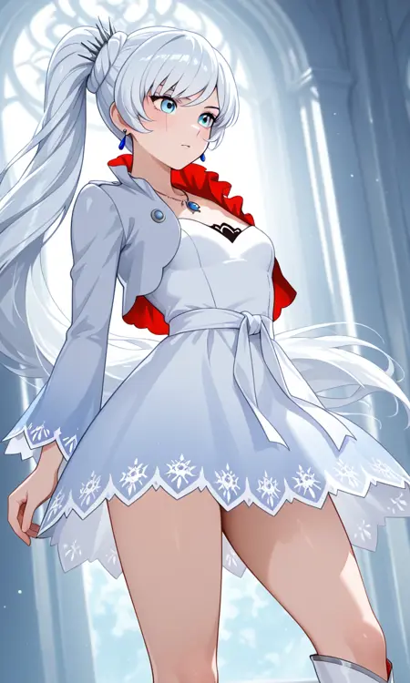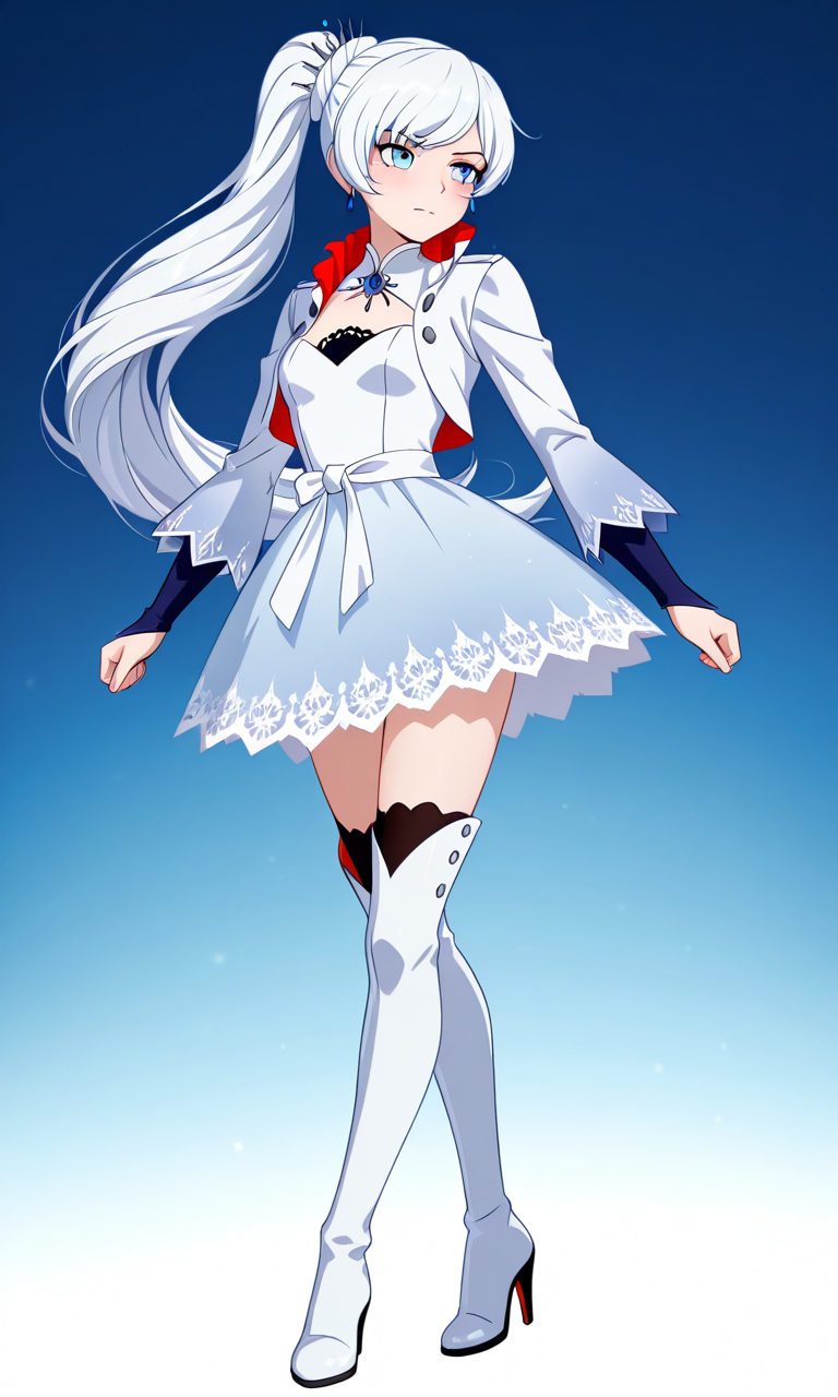 Weiss Schnee (RWBY All Volumes), 1girl, white hair, blue eyes, long ponytail, side pontyail, scar across eye, breasts, small breasts, thighs, jewelry, cropped jacket, earrings, necklace, white dress, white boots