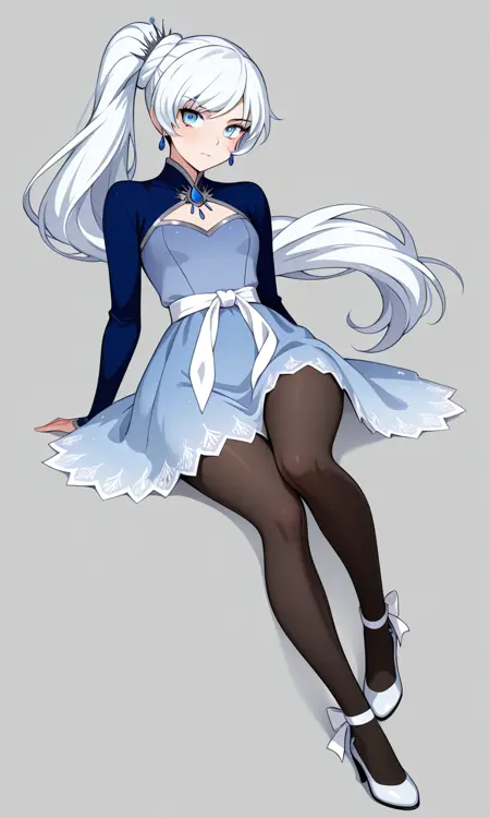 Weiss Schnee (RWBY All Volumes), 1girl, white hair, blue eyes, long ponytail, side pontyail, scar across eye, breasts, small breasts, thighs, pantyhose, jewelry, earrings, dress, cleavage cutout, shoes