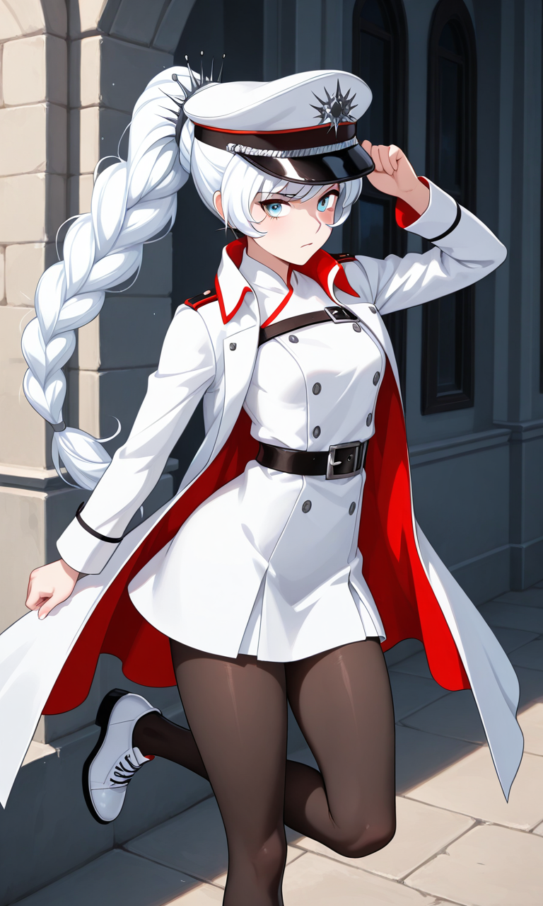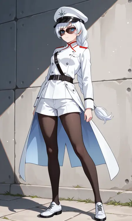 Weiss Schnee (RWBY All Volumes), 1girl, white hair, blue eyes, long ponytail, braided ponytail, scar across eye, breasts, small breasts, thighs, hat, pantyhose, belts, straps, white military uniform, peaked cap, shades, overcoat, shoes