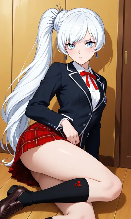 Weiss Schnee (RWBY All Volumes), 1girl, white hair, blue eyes, long ponytail, side pontyail, scar across eye, breasts, small breasts, thighs, black jacket, school uniform, red ribbon, red plaid skirt, shoes, black socks