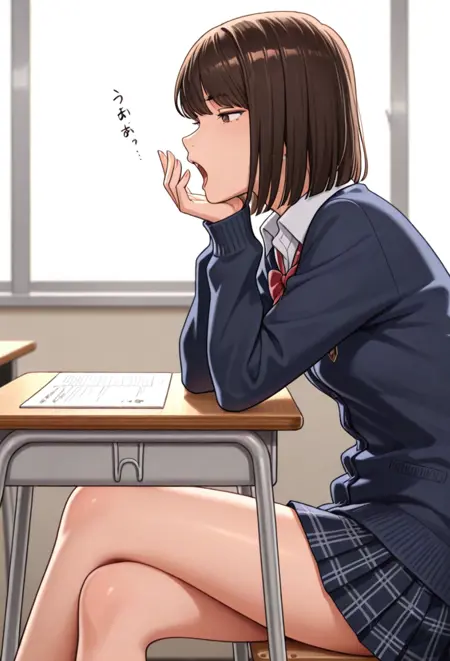 制服, プリーツスカート, チェックスカート, 青いカーディガン, 長袖, ポロシャツ, ジュエリー,