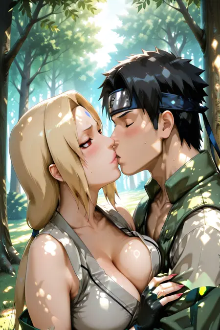 iltsunade03, 1girl, breasts, 1boy, hetero, blonde hair, nipples, tsunade \(naruto\), facial mark, forehead mark, sex, underwear, panties, breast sucking, girl on top, outdoors, open mouth, long hair, grabbing, straddling, closed eyes, grabbing another's breast, black hair, collarbone, mature female, japanese clothes, grey kimono, large breasts, cowgirl position, kimono, forest, vaginal, nature, sweat, white panties, blush, breasts out, tree, huge breasts, day, bare shoulders <lora:illustrious tsunade 03 896X1152:1>