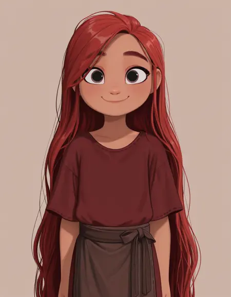 originalnimona, 매우 긴 머리, 빨간 머리, 주근깨, 검은 눈, 진한 빨간 드레스, 갈색 앞치마, 작고 갈색 부츠