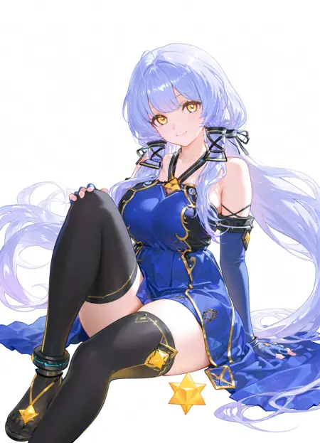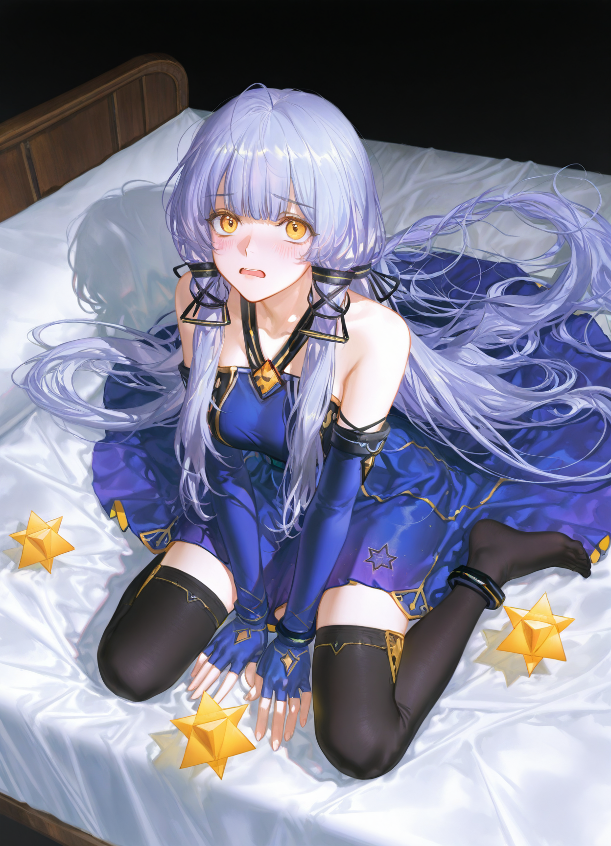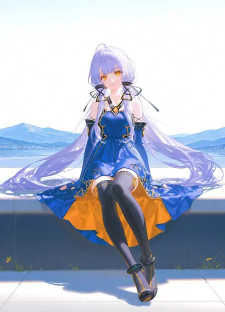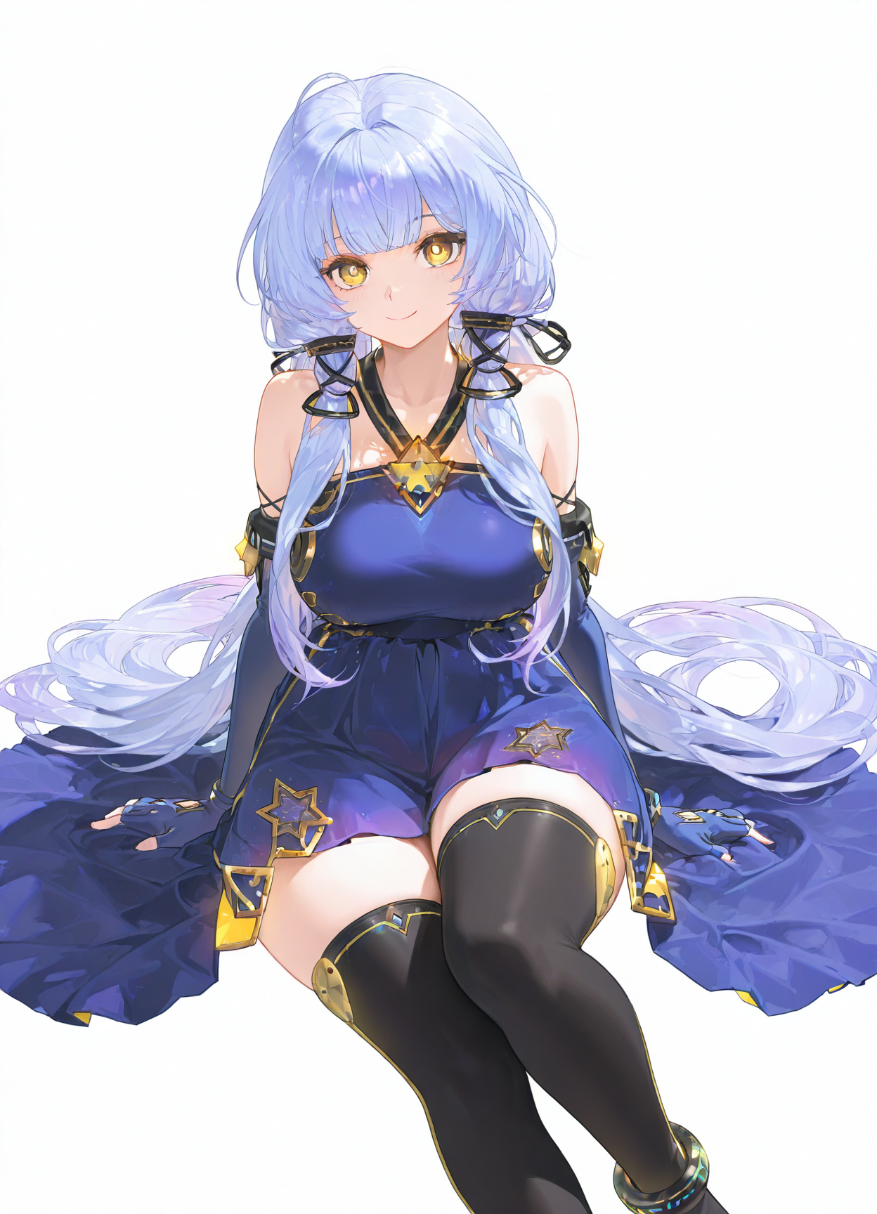 Xingchentsy,紫髪,グラデーション髪,白髪,(青髪:0.7),長い髪,非常に長い髪,四本の尾,片側の髪,髪のチューブ,髪リボン,髪のタレスリボン,浮遊する髪,黄色い目,(黄色いドレス:0.8),濃紺のドレス,あほげ,ハーネスドレス,両面ドレス,ゴールドの縁取り,肩出し,黒い太ももハイズ,太ももハイズ,青い手袋, elbow gloves,指なし手袋,黒いリボン,リボン,オレンジのスカートライナー,小胸,