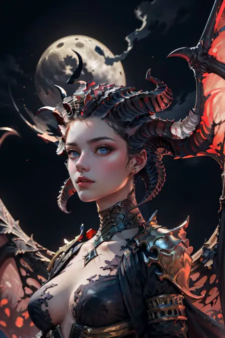 - demon horns, horns, breasts, blue eyes, demon girl, large breasts, lips, colored skin, colored sclera, collarbone, breasts apart, demon, black lips, pale skin, lipstick, makeup, helmet, dragon horns, narrow waist, curvy,