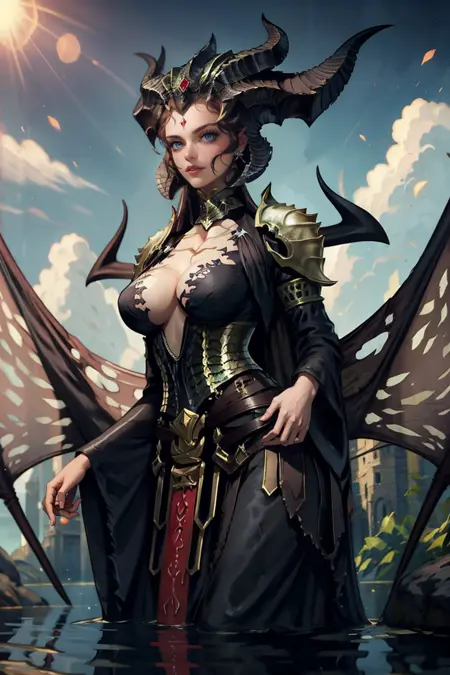 - armor, wings, demon wings, shoulder armor, jewelry, cleavage, dress, black dress, wide sleeves, large wings, corset,