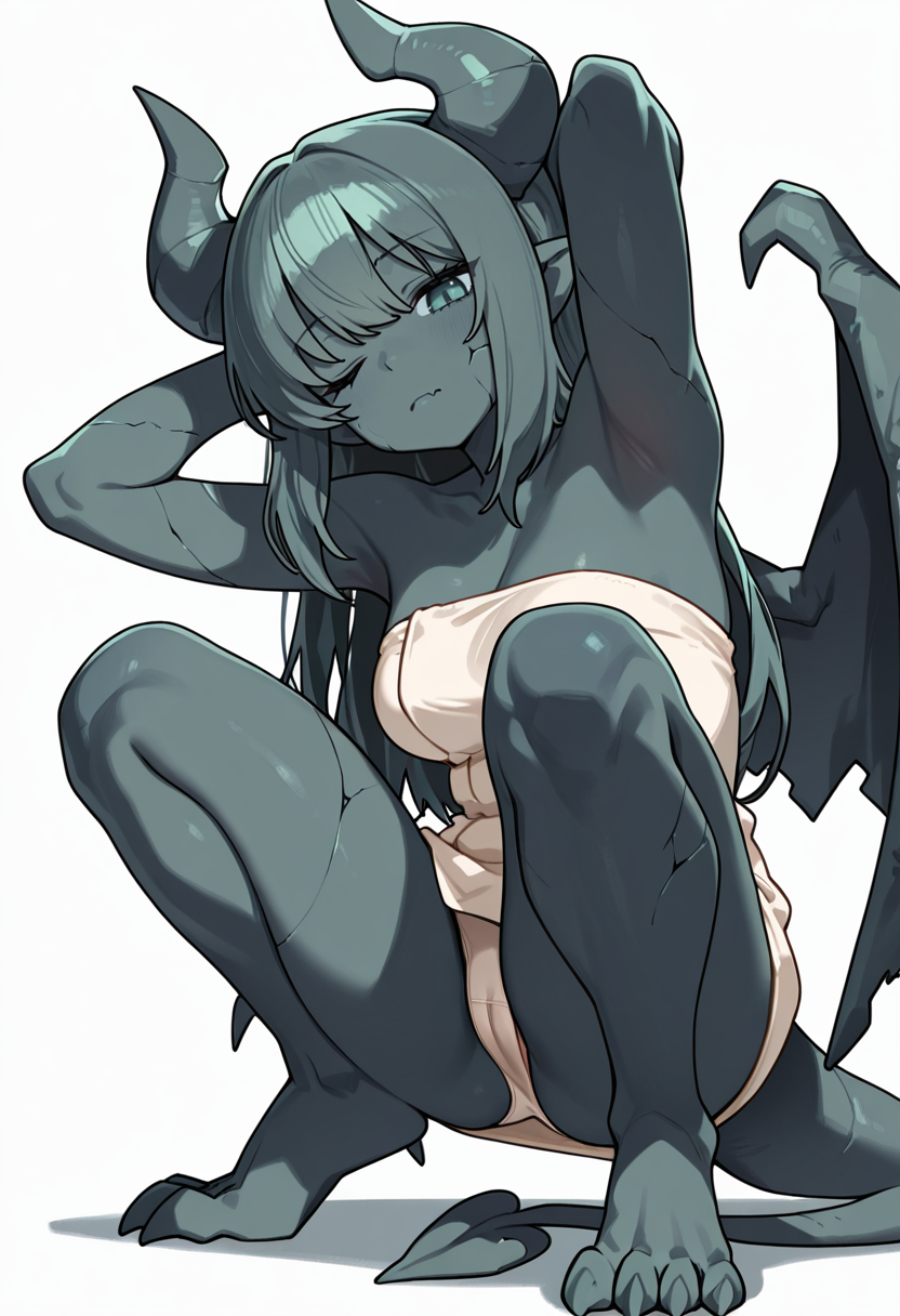 gargoyle_cnr, 1girl, dragon girl,long hair, bangs,pointy ears,demon horns, claws,skin fang,colored skin, blue skin,cleft of venus, barefoot, demon wings, demon tail,cracked skin,