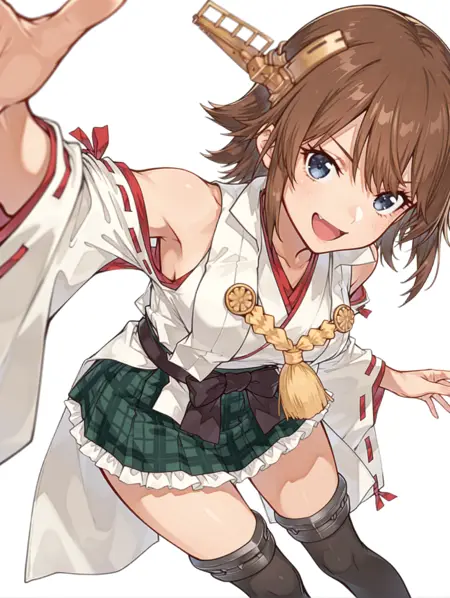 服装:h_clothes, 非传统神社巫女, 露肩, 丝带装饰袖子, 黑色腰带, 黑色丝带, 绿色格子裙, 黑色过膝袜, 大腿靴, 舵形鞋
