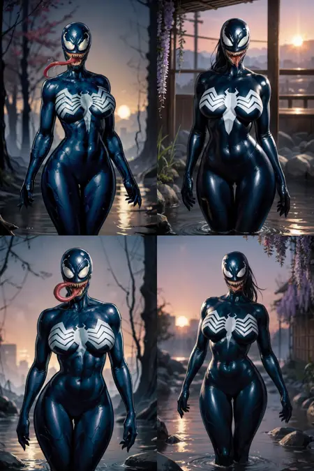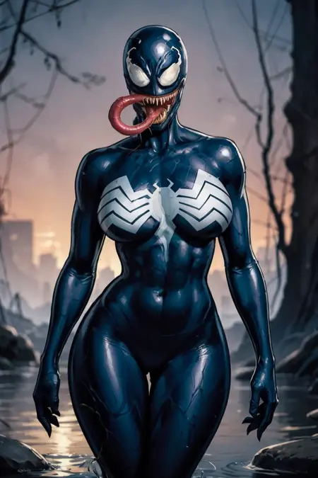 • symbiote, breasts, teeth, sharp teeth, tongue, long tongue, tongue out, large breasts, curvy, narrow waist, tall female, thick thighs, muscular female, thigh gap,