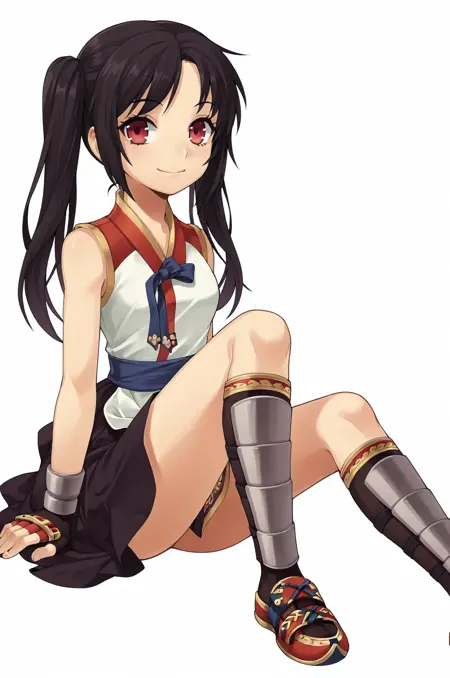 prompt: starGlaRO, korean clothes, sleeveless, fingerless gloves, bare shoulders, black miniskirt, ribbon, sandals, kneehighs, shin guards