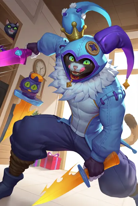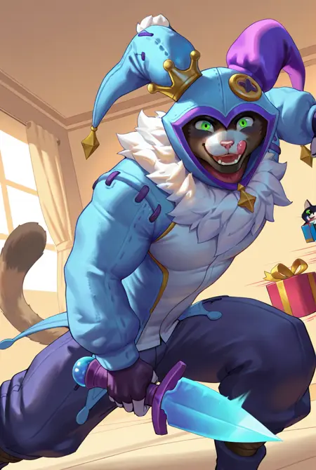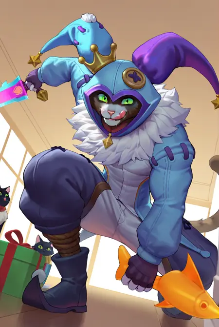 cat shac0, cat boy, furry male, gloves, green eyes, jester cap, hat, long sleeves, pants, cat tail