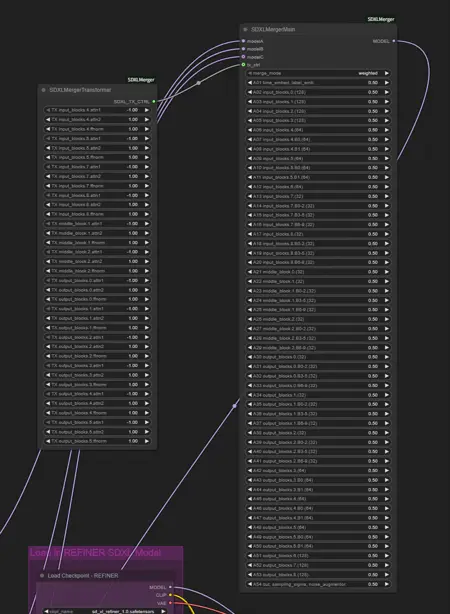 SDXL은 SuperMerger를 사용할 수 있으며, ComfyUI에는 이미 SDXL 블록 병합 노드가 있으며, 파라미터 수가 그렇게 많지 않아 단순 버전이 필요하지 않습니다. 이번에는 이전 버전들과 달리, 더 세밀한 제어를 가능하게 하는 기능을 시도했습니다.