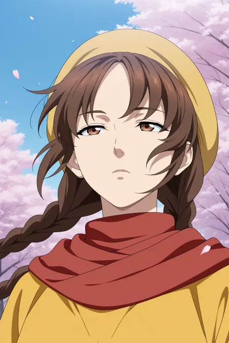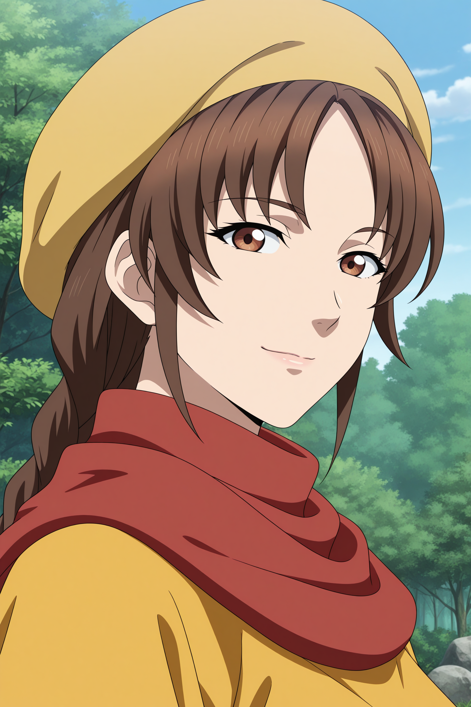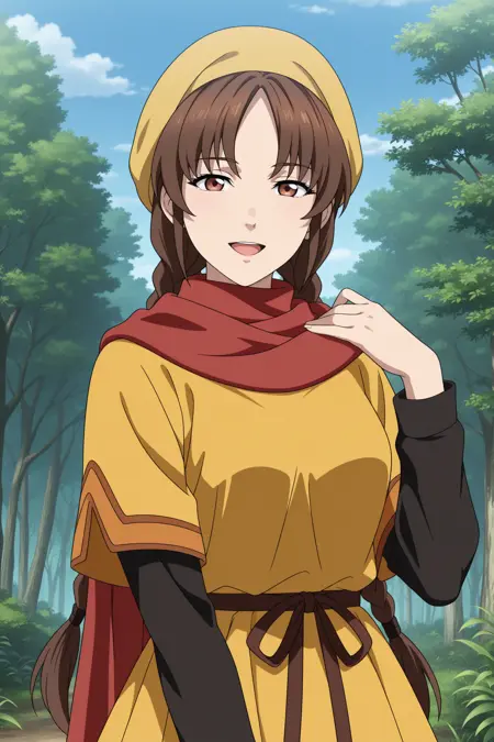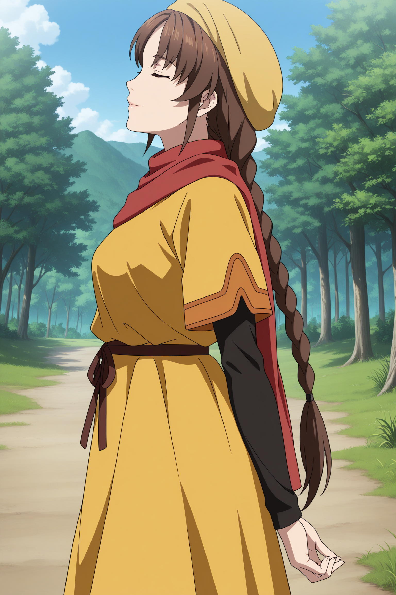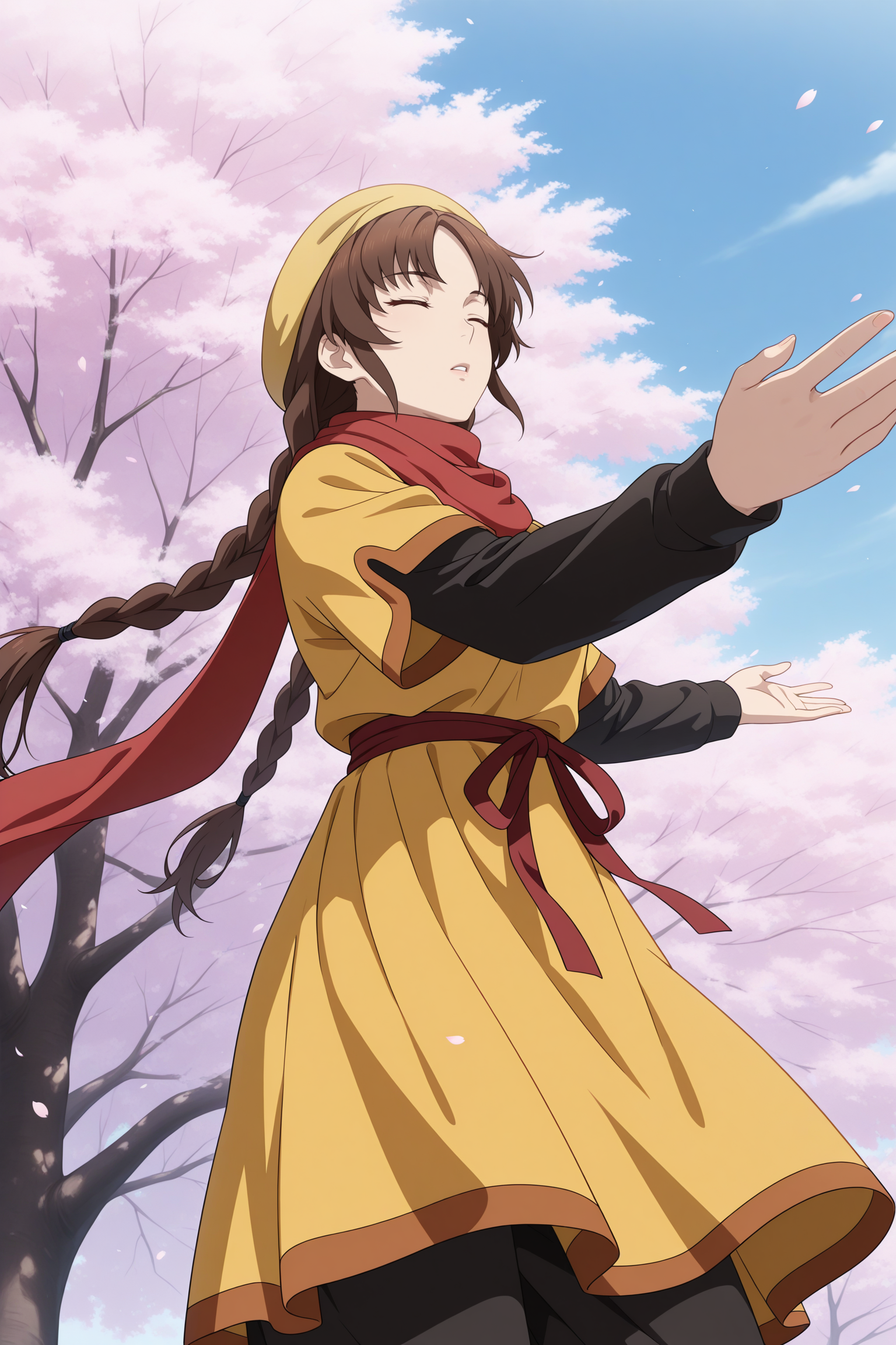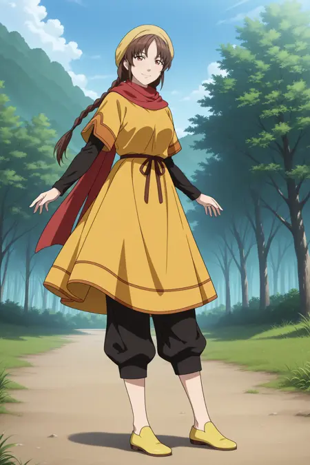 ling shenhua, long hair, brown hair, hat, twin braids, hair tie, sidelocks, parted bangs, brown eyes, short over long sleeves, black shirt, yellow dress, long dress, red scarf, waist ribbon, black pants, capri pants, yellow footwear, flats