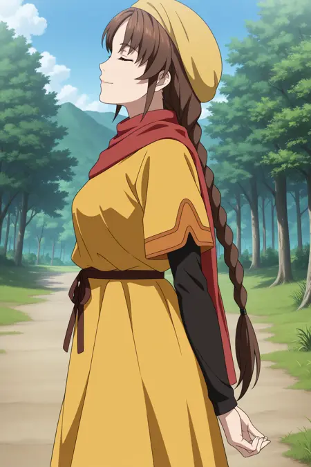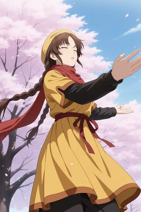 ling shenhua, 長い髪, 茶色の髪, 帽子, 二重編み, 髪留め, 横髪, 髪の分け目, 茶色の目, 短い上に長い袖, 黒いシャツ, 黄色のドレス, 長いドレス, 赤いスカーフ, ウェストリボン, 黒いズボン, カプリパンツ, 黄色の靴, フラットシューズ