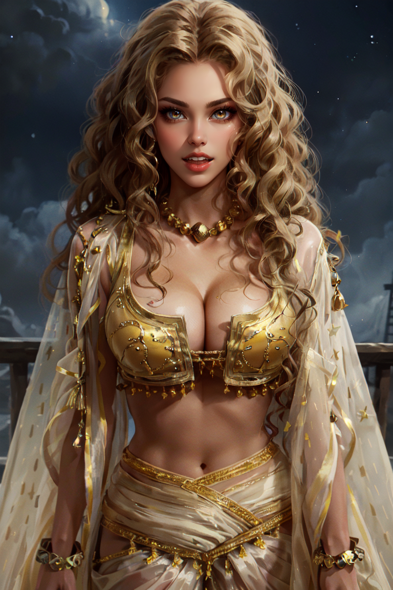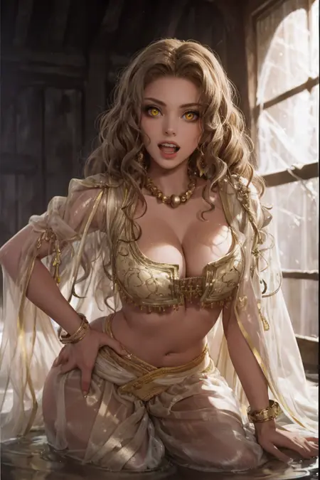 - long hair, blonde hair, breasts, lips, makeup, yellow eyes, lipstick, curly hair, wavy hair, red lips, medium breasts, narrow waist, pale skin,