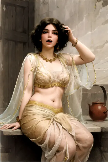 - jewelry, necklace, bracelet, midriff, navel, harem outfit, harem pants, cleavage, see-through, dress, arabian clothes,