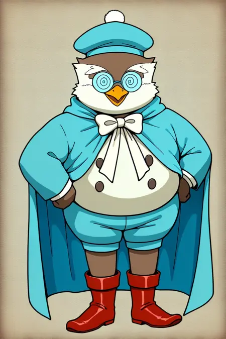 OldManOwlOVA, 1boy, brown fur, whimsical outfit, blue cape, red boots, round light blue glasses, yellow beak, small light blue hat, fat, chubby, cream colored ribbon bowtie