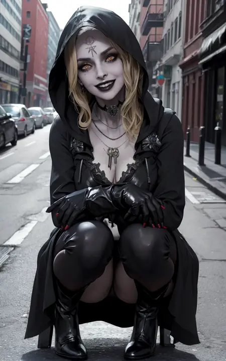 1girl, breasts, black lips, makeup, smile, medium breasts, teeth, grin, lips, pale skin, facial mark, collarbone, forehead mark, long hair, lipstick, large breasts, tattoo, blood on face, evil smile, colored skin, crazy eyes, blonde hair,