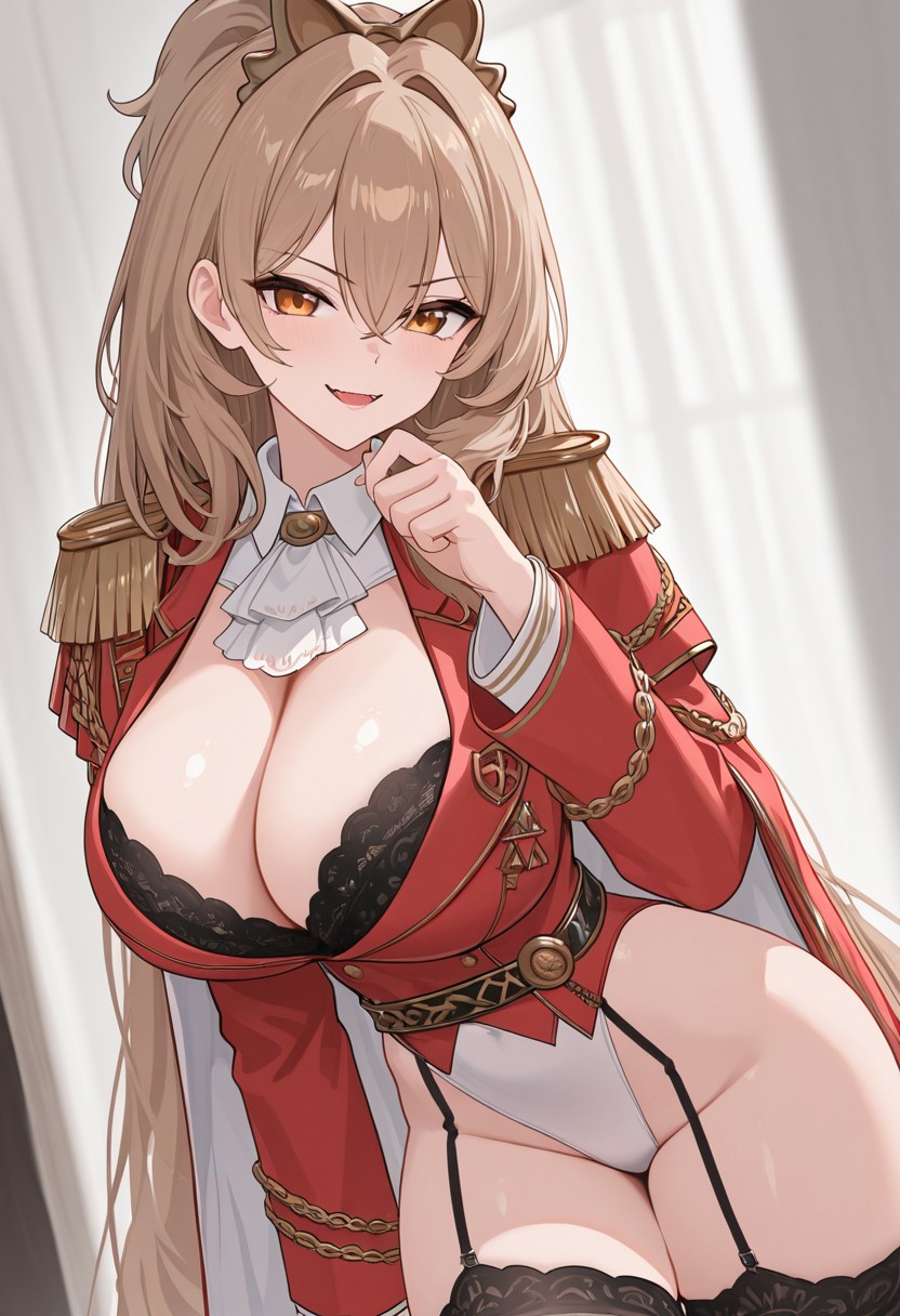 Lion, brown hair, orange eyes, black bra, black garter straps, black thighhighs, cleavage, large breasts, crossed bangs, epaulettes, hair intakes, lace-trimmed bra, leotard, long hair, long sleeves, military uniform